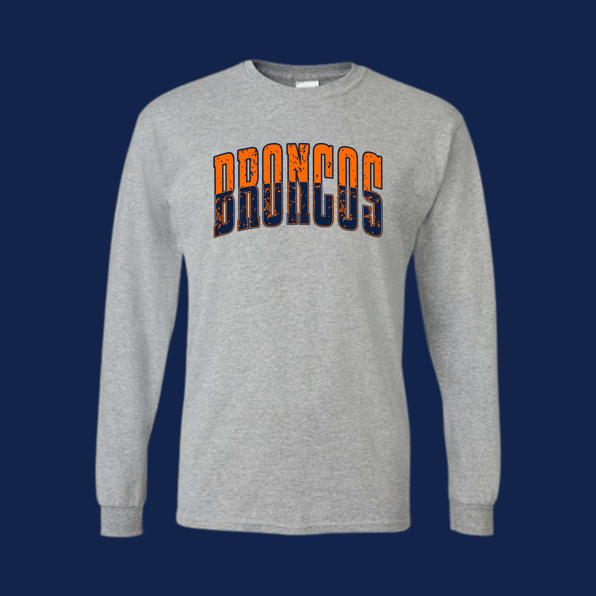 Long Sleeve Gildan Cotton Blend Shirt with Two Tone Bronco logo. Available in youth and adult sizes