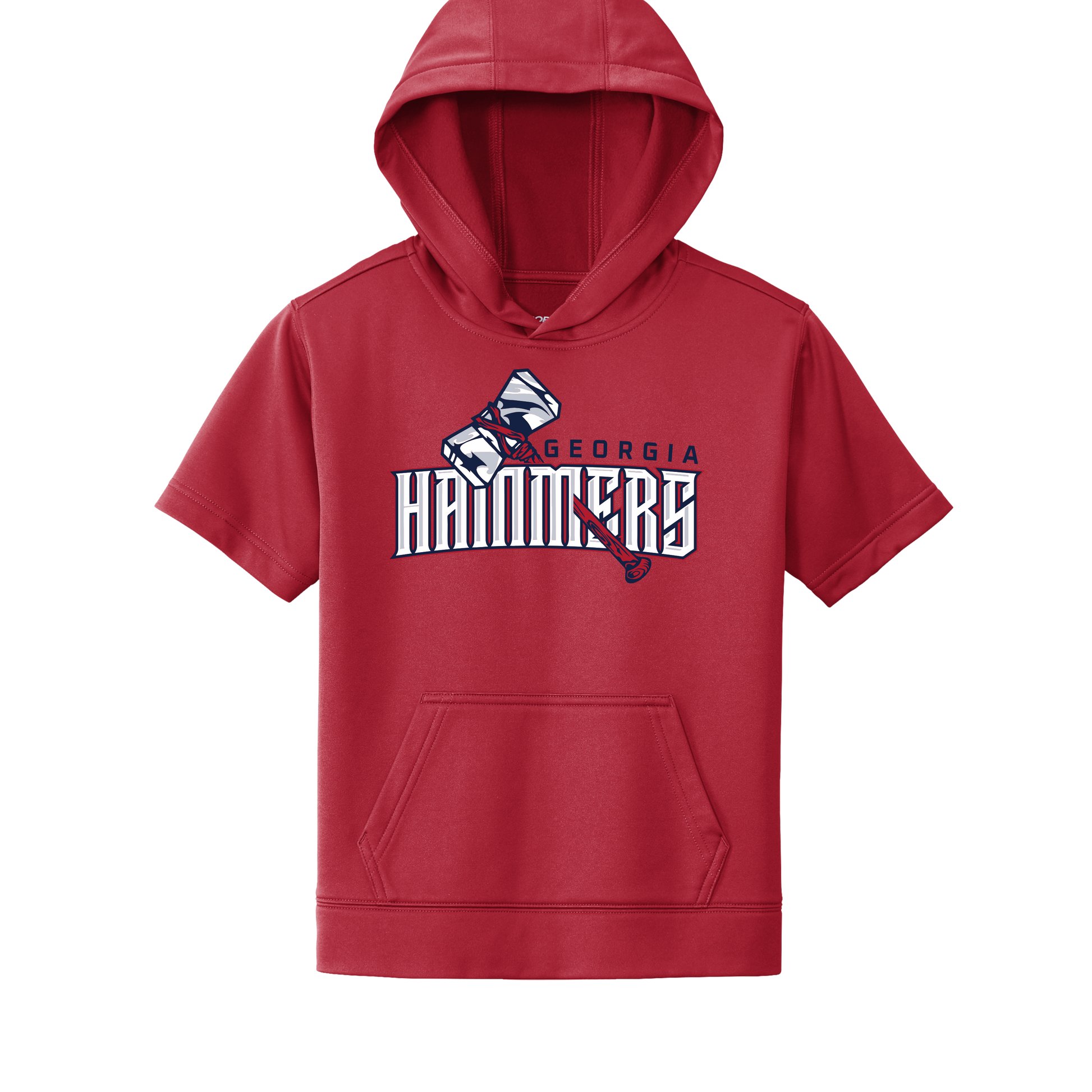 SportTek Sportwick Fleece Short Sleeve Hooded Pullover. Youth available in red and navy. Adult available in red, navy and gray.