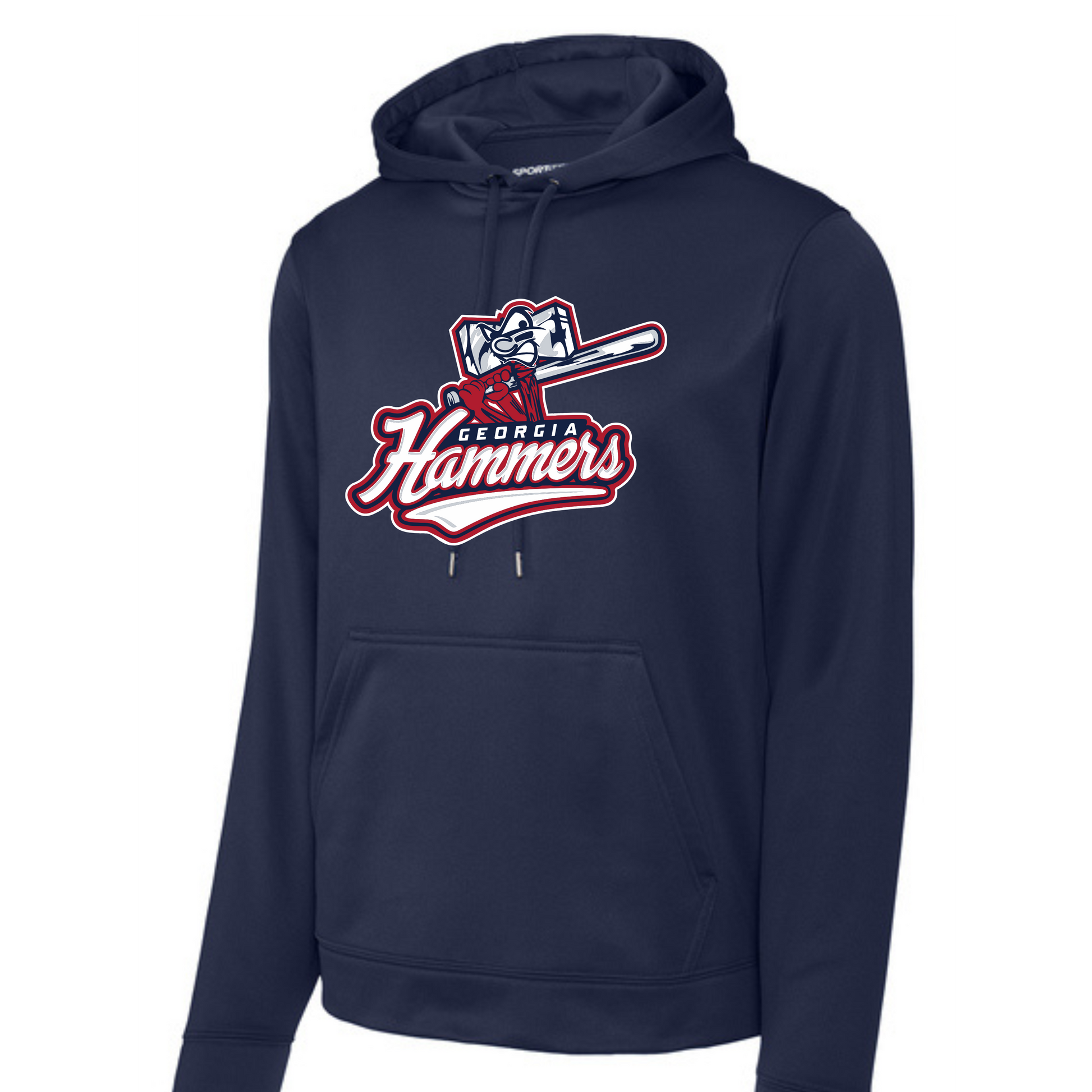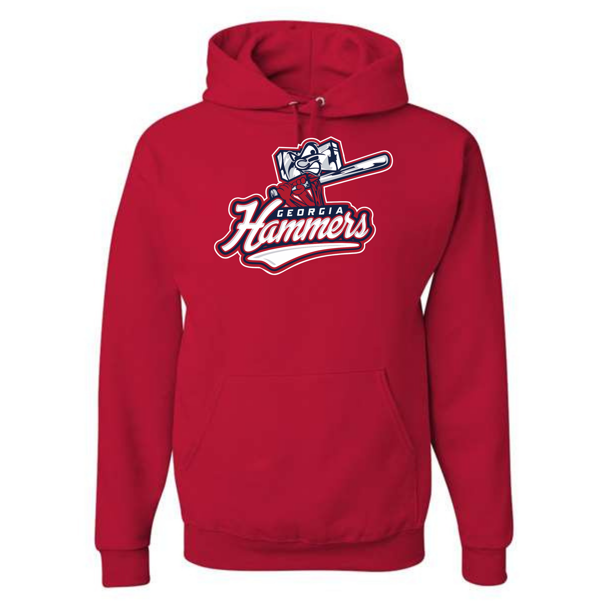 Georgia Hammers mascot design on performance or cotton blend hoodie in navy, red or gray.