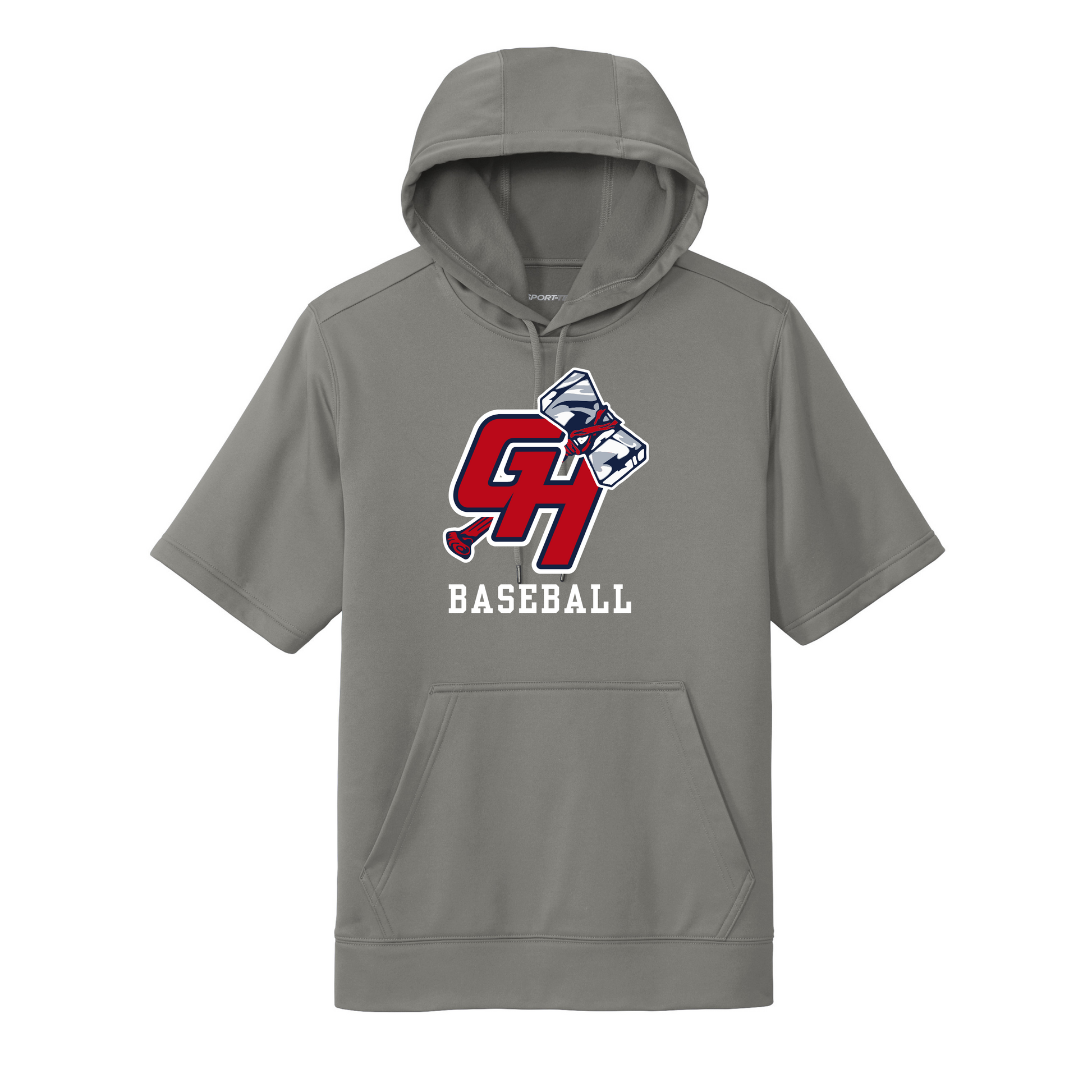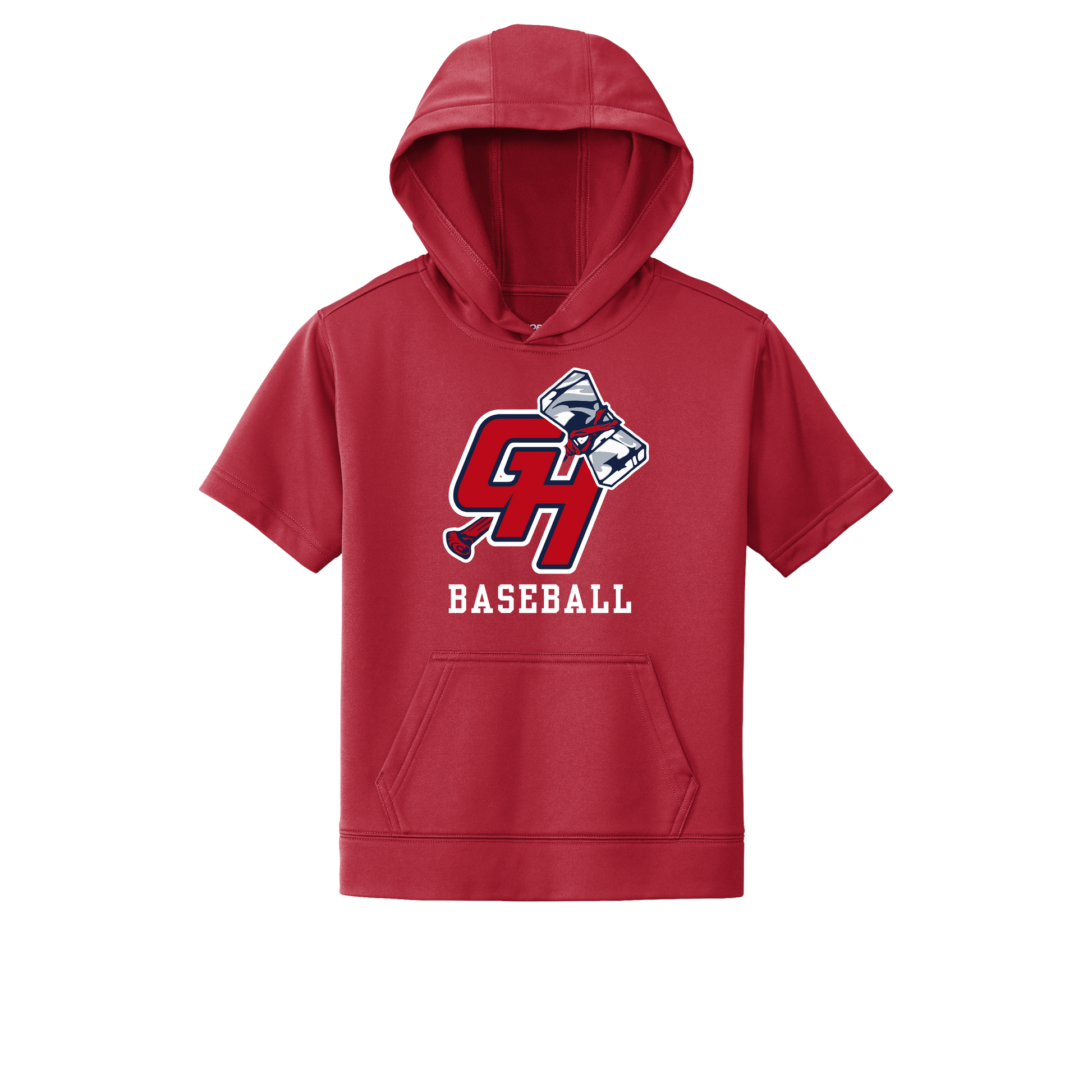GH Baseball SportTek SportWick Fleece Short Sleeve Hooded Pullover. Availalbe in red and navy for youth sizes and red, navy and gray for adult sizes.