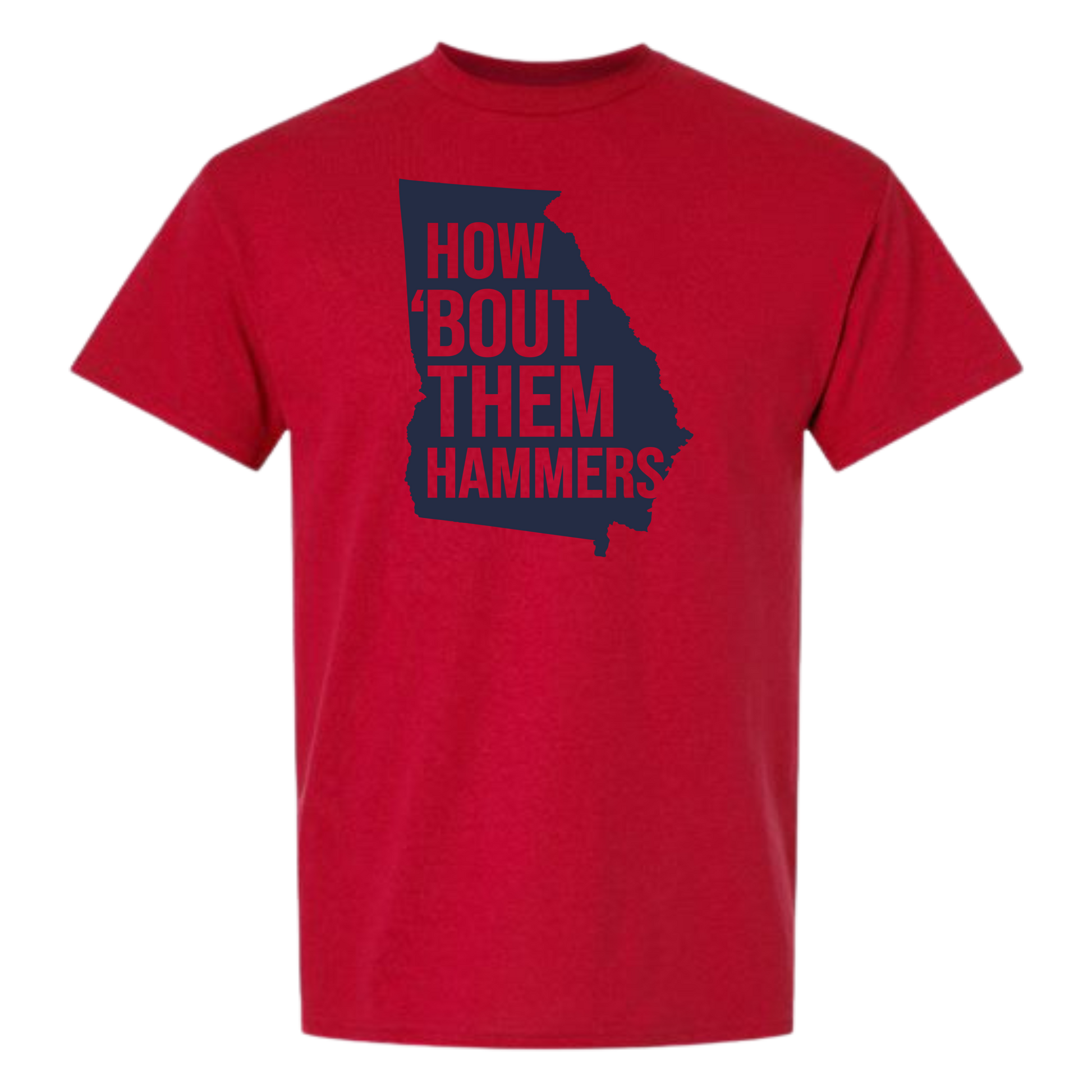 How 'Bout Them Hammers navy design on Gildan Dryblend 50/50 short sleeve shirt. White, Ash Gray or Red Shirts Available